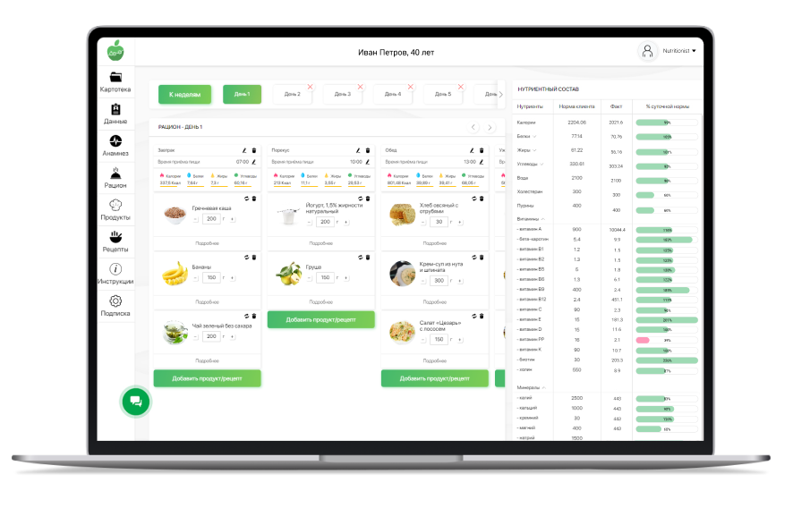 Это профессиональный инструмент для нутрициологов и врачей-диетологов, который позволяет создавать научно-обоснованные сбалансированные рационы (более 85 факторов) и автоматизировать работу с клиентами, избавляя специалиста от рутинных процессов (экономия до 80% времени)