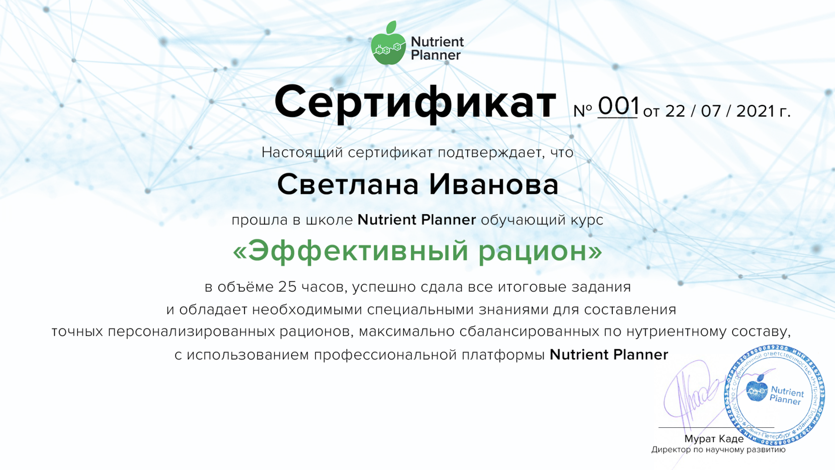 Главный результат - вы приобритёте конкурентное преимущество в виде современного профессионального инструмента, с помощью которого сможете сократить время на составление рационов, избавиться от рутинных расчетов и анализа большого числа информации, а также радовать клиентов подробными и информативными отчетами